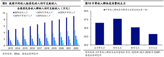 中等收入群体扩容有利于释放消费潜能。当前我国高收入户与中等收入群体之间的绝对收入存在差距,20%高收入户比20%中等偏高收入户的人均可支配收入高出约90%。但中等收入群体方为消费的主力军,据学者李实、杨修娜在《中国中等收入人群到底有多少?》一文中援引2018年CHIP所做测算,29.4%的中等收入群体创造了46.5%的全国总体消费;20%的低收入群体转化为中等收入群体即能带来8%的总消费增长。因此,未来在共同富裕的逐步落实过程中,扩大中等收入群体数量、提高中等收入群体收入,可以有效扩大内需,推动消费升级。