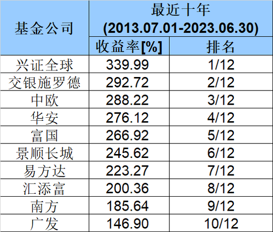 兴证全球基金紧随其后,以339.99%的收益在68家基金中排名第二,诺德基金则以331.27%的收益率位列第三,目前只有这3家公司最近10年的收益率超300%。
