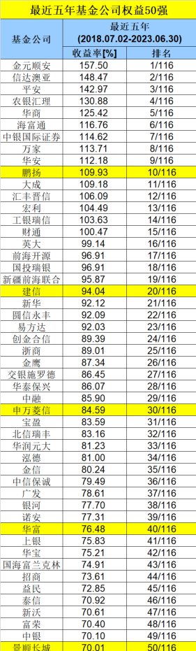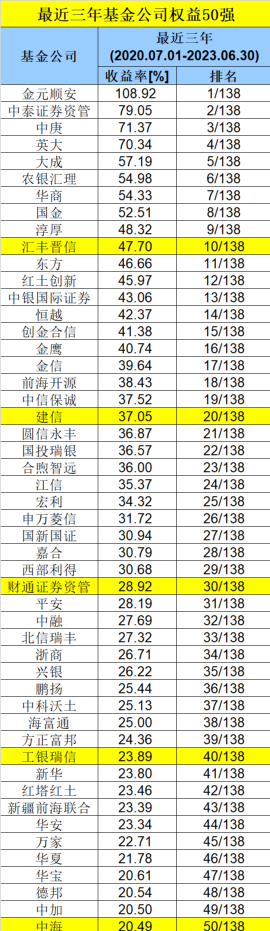 海通证券数据显示,从3年期(2020年7月1日到2023年6月30日)绝对收益排名看,三年期冠军和五年期一样,均为金元顺安基金,旗下权益类基金平均收益达到108.92%,在137家公司中排名第一,也是目前三年期收益率唯一一家超过100%的基金公司。
