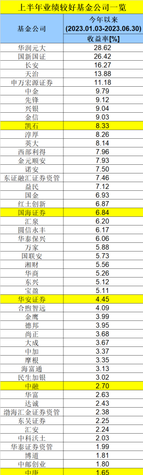 此外,长安基金、天治基金、申万宏源证券等半年收益率超过10%,而中金公司、先锋基金、兴银基金、金信基金、凯石基金、淳厚基金等也表现不俗,基本是中小型基金公司业绩较好。