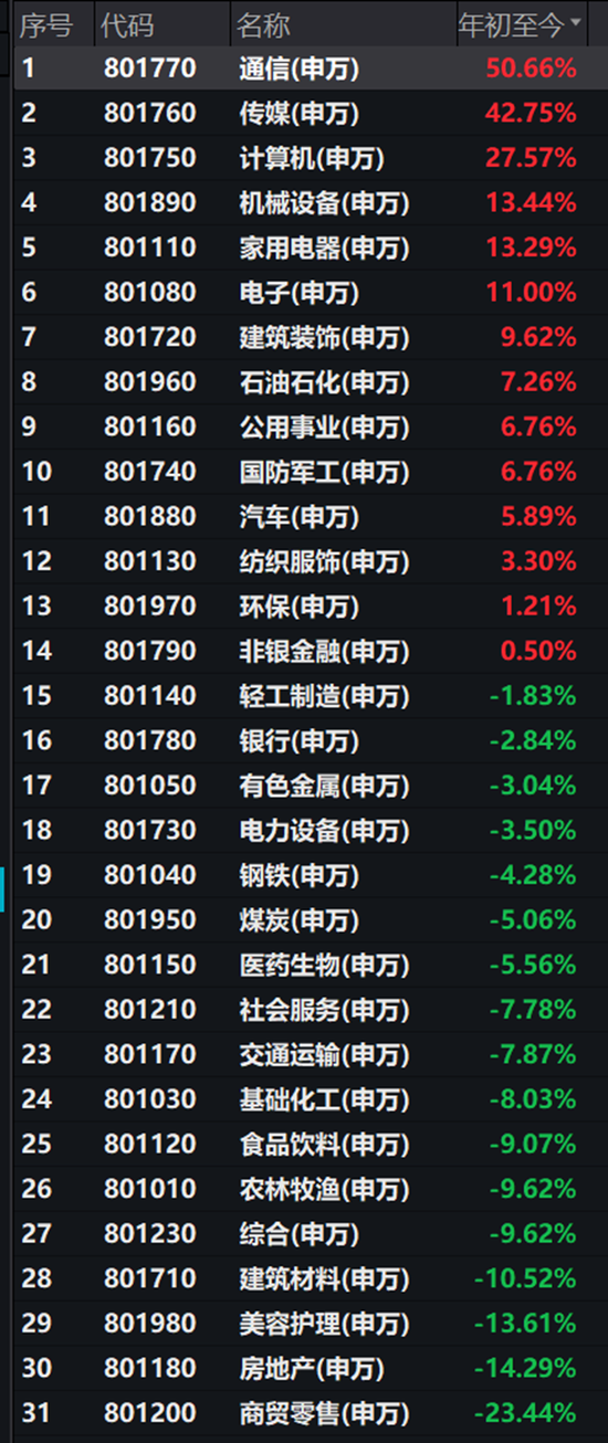 人工智能衍生出的板块与个股毫无疑问是今年上半年最赚钱的品种。通信、传媒、计算机位列申万一级行业指数的上半年涨幅前三。上半年跌幅前三的一级行业指数则是商贸零售、房地产、美容护理。