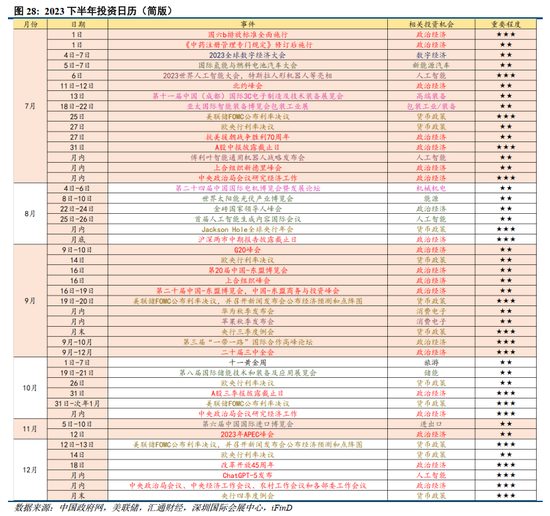 多因素叠加市场的稳增长政策预期强,后市有望上涨。随着7月政治局会议的临近,市场的稳增长政策预期不断增强。一系列产业政策、扩大内需政策、降低资金成本和房地产支持政策陆续出台,我们相信还有更多政策在路上。6月27日,国务院总理李强表示,中国将在扩大内需潜力、激活市场活力等方面推出更多务实举措,有信心有能力在较长周期内推动中国经济行稳致远;预计第二季度经济增速将快于第一季度;预计中国将实现2023年5%的经济增长目标。种种现象表明,下半年的市场将重新上涨。