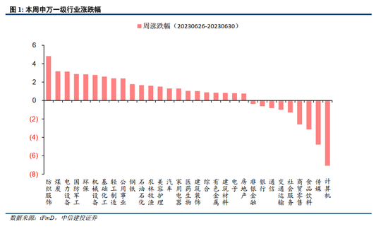 市场结束二次探底,板块轮动持续。本周指数略有回升,沪深300小幅下跌0.08%,深证成指、创业板指本周分别上涨0.44%、1.06%;中证 500、国证 2000 为代表的中小盘指数分别下跌2.56%和1.78%。行业方面,31个申万一级行业轮动,各行业表现方差较大,纺织服饰和煤炭领涨,分别上涨4.82%和3.17%;TMT行业,计算机与传媒跌幅居前,分别下跌7.08%、4.79%。市场风格维度,国证成长和国证价值表现尚可,分别小幅上涨0.15%和0.29%。