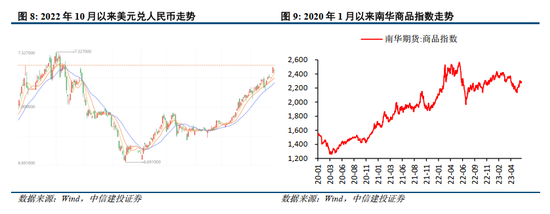 国内方面,市场危机与机遇并存。2022年10月底,人民币汇率最高升至约7.33,5月以来人民币汇率加速上行并突破7.0关口,并于近日到达7.26。6月30日,央行主管金融时报发文称,中美货币政策分化带来的利差变化、美元汇率阶段性走强等因素给人民币汇率带来了短期的、阶段性的压力。不过,随着国内经济稳步复苏,加之外贸保持韧性,人民币资产具备长期吸引力,人民币汇率稳定有坚实的基本面支撑,下半年人民币汇率有望继续在合理均衡水平上保持基本稳定。另一方面,2022年10月底,南华商品指数最低降至2135.78,而近期触及最低点2134.04后迅速反弹,商品价格下行态势有所缓解,未来有望继续回升。