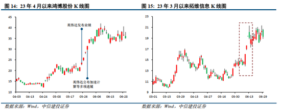 五月末以来,随着英伟达业绩大增、技术突破等催化的落地,算力等有望验证景气的相关板块率先走出了独立行情。5月25日,英伟达发布一季度业绩报告,净利润环比增长25%,此外预计二季度销售额110亿美元,同比增长64%。盘后,英伟达股价狂飙逾20%,“一晚上涨出了一个AMD”。次日,A股算力板块强势爆发。以和英伟达合作成立北京AI创新赋能中心的鸿博股份为例,当日该股高开高走收涨停,并就此开启新一轮上涨。而后在互动平台表示“公司生产的AI服务器支持英伟达GPU的运行”的拓维信息,也随即斩获三连板,股价创出新高,晋级为算力龙头。此时的“英伟达”概念股恰如彼时的“特斯拉”概念股,其本质都是海外龙头公司景气的率先验证,从而带动产业链的相关公司预期转强。