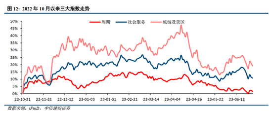 中期以板块点位为锚点判断经济预期恶化的底线。当前市场对经济的预期已经极度低迷,然而即使后续市场预期进一步恶化,今年的底线也大概率不会低于去年三四季度防疫优化前且海外紧缩正盛的时刻。因此,我们可以用相关板块在去年的低点判断市场预期恶化的底线。首先,我们可以将申万周期指数(801271.SL)在2022年10月31日的低点作为市场预期第一级别的底线,本轮调整的最低点离前期低点仅有0.17%的空间;由于服务业的复苏情况强于制造业,我们可以将社会服务指数(801210.SL)作为市场预期第二级别的底线,那么本轮调整最低点离前期低点仍有8.68%的空间;考虑极端情况,我们可以将旅游及景区指数(801993.SL)作为市场预期第三级别的底线,那么仍有13.01%的空间,但后两种情形发生的概率极小。