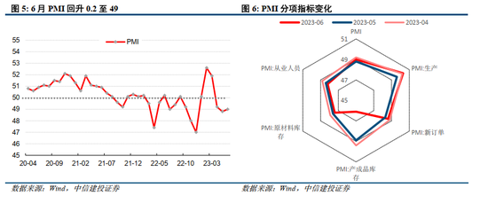 6月PMI回升0.2至49,结束了连续3个月的回落走势。从分项来看,PMI生产指数明显上升0.7达到50.3,超过临界值。这反映出疫情对生产的扰动过去之后,企业生产已经有了明显恢复。需求同样有所改善,新订单指数小幅上升0.3到48.6。另外主要原材料购进价格指数和出厂价格指数分别为45.0和43.9,比上月上升4.2 和2.3,而产成品库存则大幅下降了2.8。PMI数据显示中国经济虽仍旧偏弱,但已出现复苏迹象,即将迎来单月环比改善。