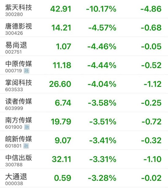 传媒板块中,紫天科技(维权)跌超10%,唐德影视、易尚退、中原传媒、掌阅科技、读者传媒、南方传媒等纷纷下挫。