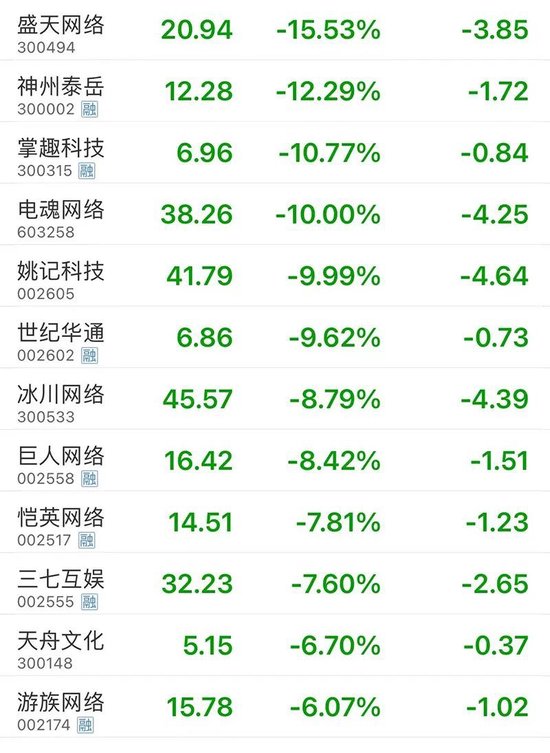 今日早盘,AI概念股再度集体下挫,网游、传媒等应用方向领跌。截至午间收盘,游戏板块中,盛天网络、神州泰岳、掌趣科技跌超10%,电魂网络、姚记科技跌停,世纪华通盘中触及跌停,冰川网络、巨人网络、恺英网络(维权)、三七互娱(维权)、游族网络跌超6%。