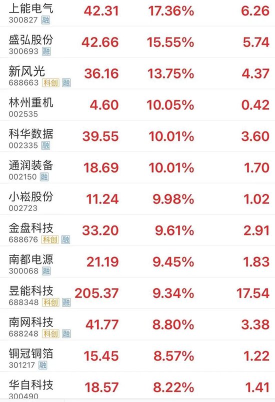 今日早盘,光伏、储能板块集体走强。截至午间收盘,上能电气大涨逾17%,盛弘股份、新风光、禾迈股份涨超10%,林州重机(维权)、科华数据、通润装备、小崧股份涨停,金盘科技、昱能科技、南都能源、南网科技等涨幅居前。