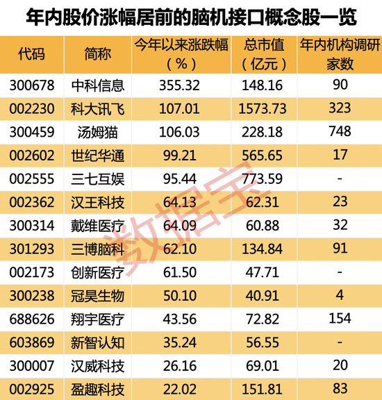 证券时报·数据宝统计,因多股同时涉及人工智能、ChatGPT等多重概念,A股20余只脑机接口概念股大幅度跑赢大盘,今年以来平均上涨54.73%。其中,中科信息、科大讯飞、汤姆猫年内股价累计上涨幅度均超100%,股价实现翻倍甚至翻多倍上涨。