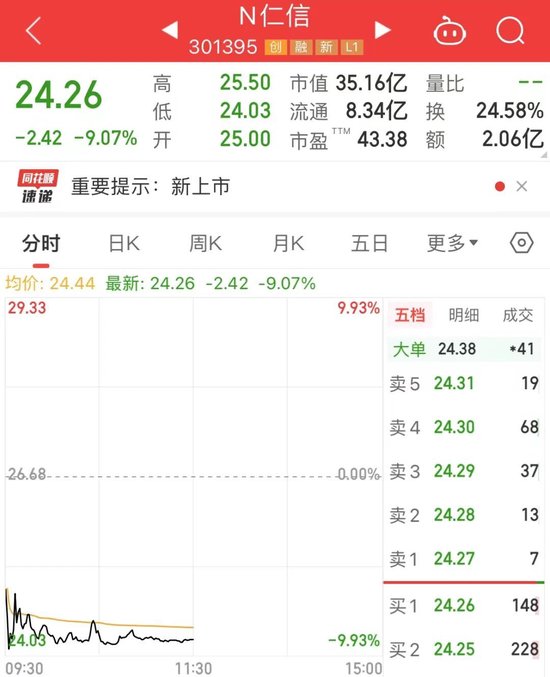 仁信新材今日上市,开盘以跌逾6%直接破发,盘中一度大跌近10%。截至上午收盘,该股大跌9.07%,报于24.26元,总市值为35.16亿元。仁信新材的发行价格为26.68元/股,中一签500股需缴款1.33万元;按当前价格计算,中签股民中一签大约亏损1210元。