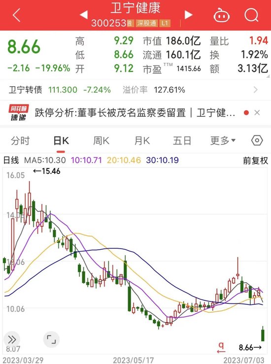 卫宁健康今日开盘1分钟触及20cm跌停。截至上午收盘,该公司股价为8.66元,总市值为186亿元,较上一个交易日收盘市值蒸发46亿元,超过22万手卖单挂在跌停板。