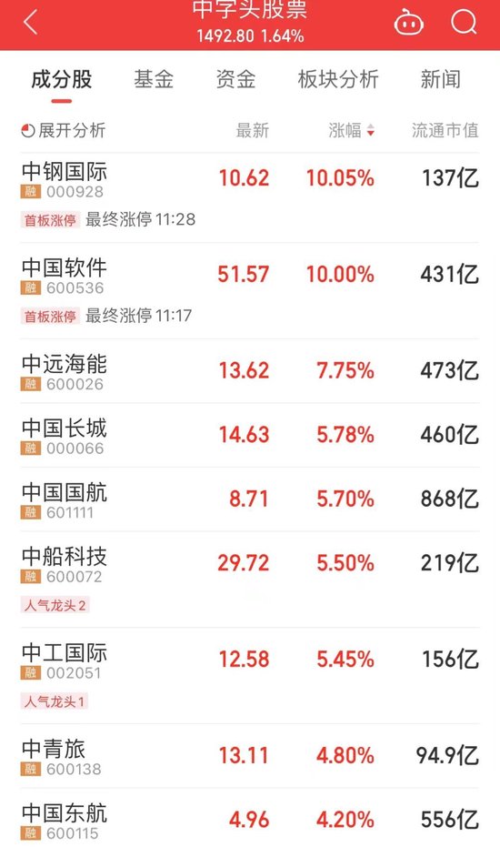 今日早盘,以大金融、中字头为首的权重板块拉升,中国软件拉升封板,中钢国际涨停,中远海能、中国重汽、中国长城、中国国航涨超5%。