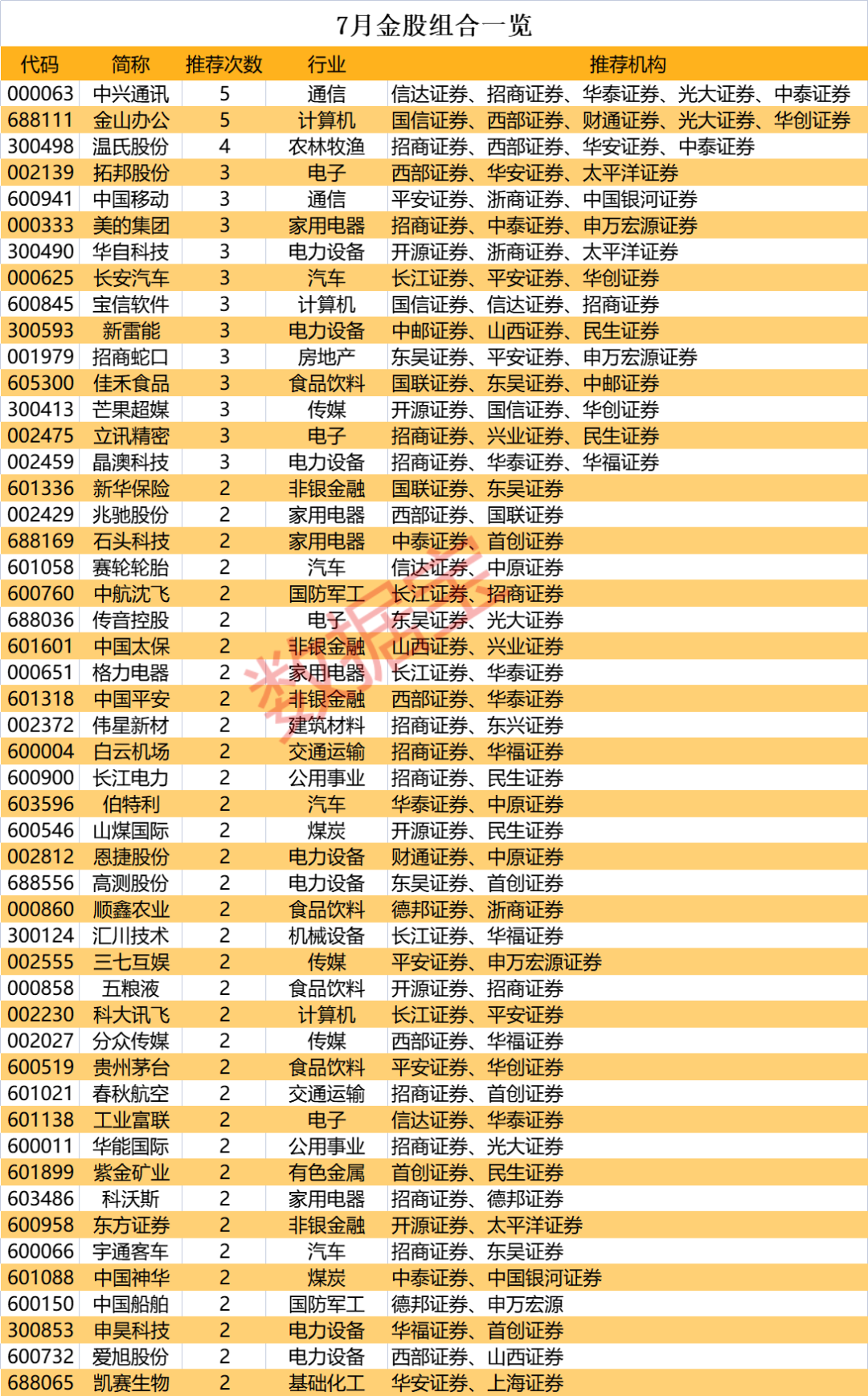 7月券商“金股组合”出炉