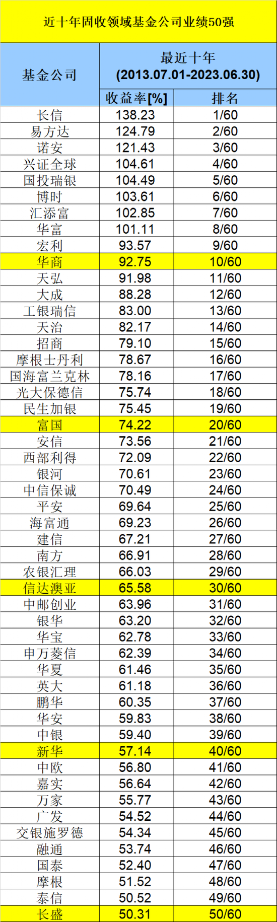 海通证券数据显示,2013年7月1日至2023年6月30日这10年间,收益率排在60家基金公司“冠亚季军”的是长信基金、易方达基金、诺安基金,最近10年的收益率高达133.97%、124.79%、121.43%,和后面的基金公司拉开业绩差距。易方达受益于较好的中长期业绩,其固定收益规模都非常大,妥妥的“固收大厂”。