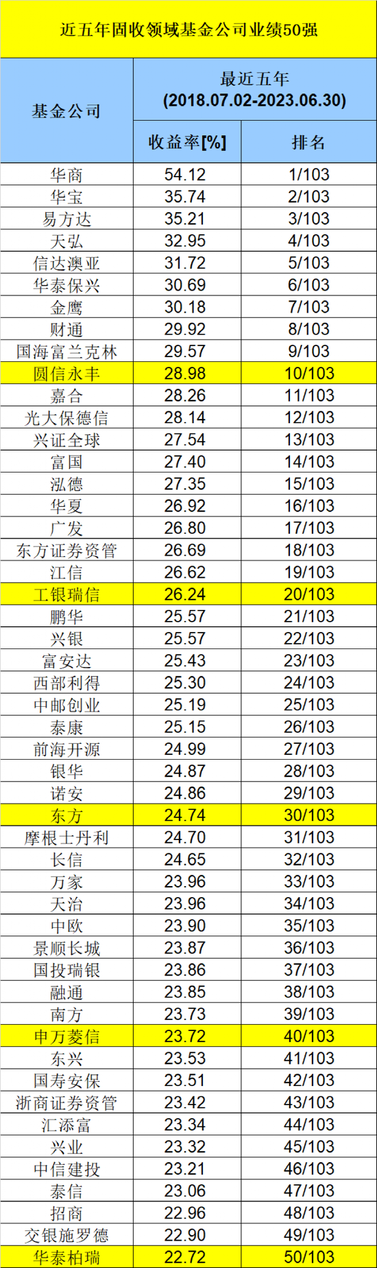 数据显示,在固收类基金最近五年(2018年7月2日至2023年6月30日)净值增长排行中,华商表现在103家可比公司中最为优异,净值增长率高达54.12%,位列第一。