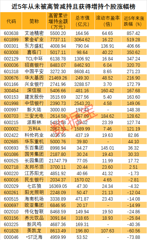 梳理发现,重要股东没有减持、高管不断增持的股票并不多。数据宝从另一个角度出发,即高管近年来从未减持且大举增持的个股,这类同样得到“内部人士”关照有加的股票,表现又如何呢?
