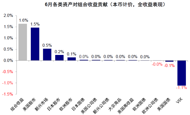6月,我们的海外资产配置组合上涨1.6%(本币计价);领先于全球债市(0.04%,美银美林全球债券指数,美元计价),但弱于全球股市(5.5%,MSCI全球指数,美元计价)和大宗商品(2.3%,标普高盛商品指数,美元计价)。分项看,美国、新兴等主要市场贡献明显,VIX为主要拖累。自2016年7月成立以来,该组合累积回报106.7%,夏普比率2%。