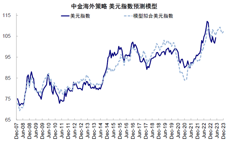 ? 美元:维持高位震荡,趋势拐点要待中国增长修复。往后看,基准情形下虽无大涨空间,但可能维持高位一段时间。根据我们的美元指数预测模型测算,美元指数支撑位 100,阻力位为 105,趋势性拐点仍有待中国增长修复。
