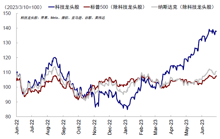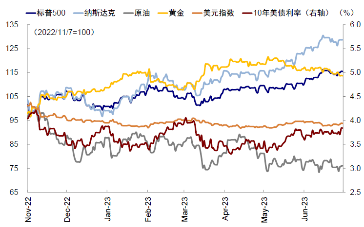 美联储维持鹰派、经济数据表现强劲支撑本月加息预期持续升温。6月FOMC美联储“按兵不动”,将基准利率维持在5%-5.25%,但会议更新的“点阵图”及鲍威尔本月的多次发言均表示年内仍有两次加息可能,态度明显偏鹰。另一方面,包括一季度GDP、房地产新屋开工及销售、耐用品订单等一系列数据均较为强劲,加息预期进一步升温,带动美债利率再度抬升至3.8%以上。短期投资者情绪和资金抱团持续支撑美股科技龙头股表现,但主要经济数据的好转同样带动价值板块反弹,其中银行股受益于月末美联储公布的压力测试,结果显示极端情形下美国大银行能够抵御严重经济衰退带来的冲击。