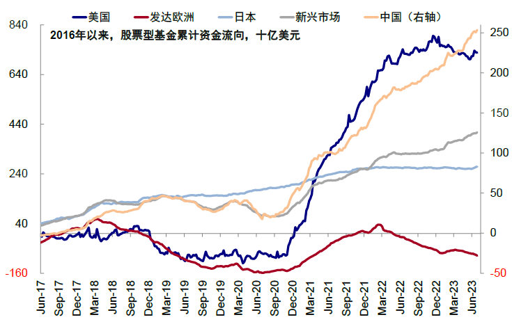 图表38:6月,美股转为流入,中国、新兴市场、日本市场流入加速,发达欧洲流出加速