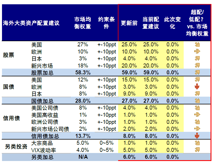 基于上文分析,面对美国7月核心通胀低基数的噪音和中国关键政策窗口的兑现期,7月维持当前配置按兵不动或是最优选。不过,如果美股和美债因此出现明显回调,反而可能提供更好再介入时机;相反,除非出现宽信用的有效手段,短期政策预期推动的中国市场反弹或仍缺乏持续性,若未能兑现反而面临下行压力。中期角度,我们维持在下半年展望《全球市场2023下半年展望:软着陆与慢爬坡》中的判断,三季度美国宏观主线是通胀降、四季度是增长弱,故四季度压力相对大一些。总体配置,长债/黄金>股票>大宗商品。股票继续重结构“哑铃”,成长>高分红>周期/价值。具体来看: