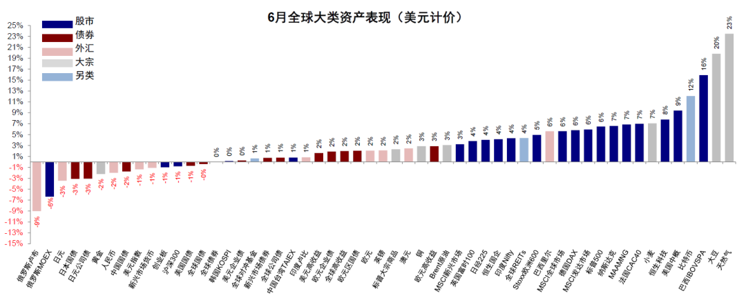 图表1:6月,美元计价下,股>大宗>债,天然气、大豆、比特币、海外中资股及美股领涨,俄罗斯股汇领跌