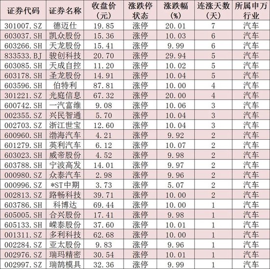 表:今日25只涨停的汽车股情况