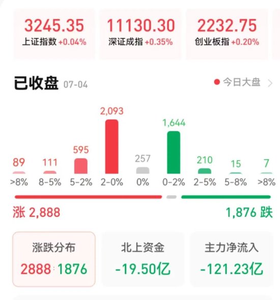 周二(7月4日),A股三大股指震荡上行,全线飘红。截至收盘,上证指数微涨0.04%报3245.35点,深证成指涨0.35%报11130.3点,创业板指涨0.2%报2232.75点,两市合计成交金额达9293亿元,北向资金净卖出19.5亿元。总体上看,两市个股涨多跌少。其中,涨停个股达60只,跌停个股5只。