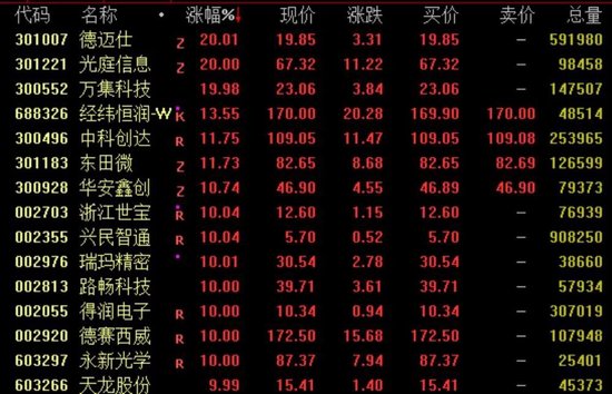 今日,汽车产业链股表现强势,无人驾驶概念爆发,德迈仕、光庭信息、万集科技“20cm”涨停,路畅科技、德赛西威、永新光学等均涨停;汽车零部件股亮眼,浙江世宝、圣龙股份斩获3连板,英利汽车、多利科技等亦涨停;半导体板块大幅拉升,聚辰股份涨逾15%,斯达半导涨停;值得注意的是,今日上市的创业板新股豪恩汽电大涨50%报90.01元,以此收盘价算计,单签盈利达2.5万元。此外,昨日跌停的卫宁健康今日继续下挫,收盘下跌近11%;保健品龙头汤臣倍健大幅跳水,收盘下跌12.37%报21.25元。