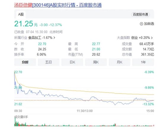 保健品龙头汤臣倍健(300146)盘中大幅跳水,盘中一度跌超13%。截至收盘,该股下跌12.37%报21.25元,全日成交14.7亿元,最新市值361亿元。