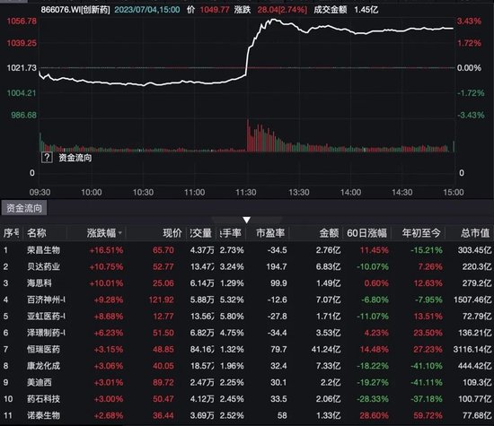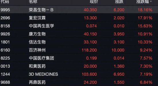 板块内个股方面,荣昌生物涨16.51%,贝达药业涨超10%,海思科、通化金马涨停,百济神州、亚虹医药、百利天恒、亚虹医药等涨超8%。此外,港股医药股也大涨,荣昌生物港股涨超18%,盘中一度涨超22%。复宏汉霖、中国再生医学涨超15%,康方生物、信达生物张超10%。中国医疗集团、和黄医药等涨超7%。