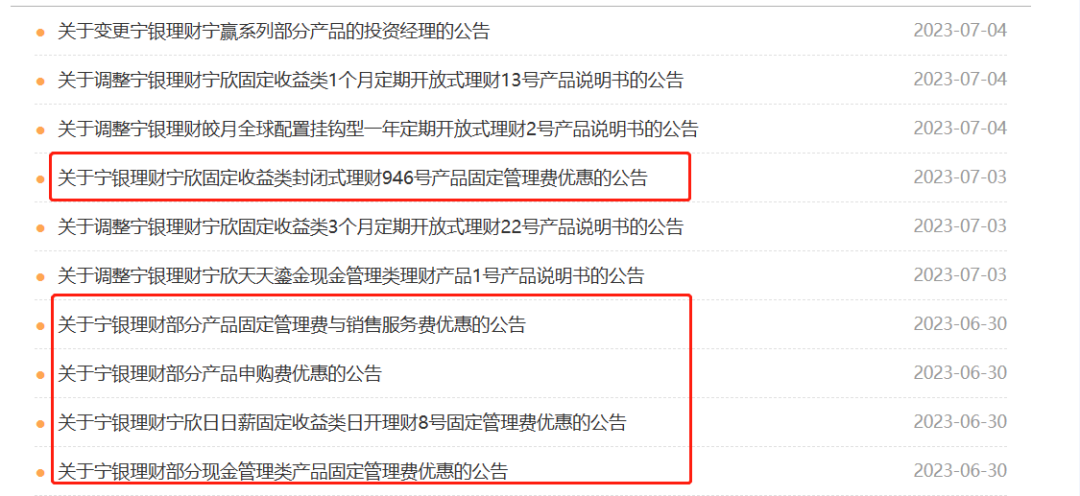 同日,宁银理财也发布相关公告,并亮明了优惠期限——两年。公告称,自2023年7月6日(含)起至2025年7月4日(含)止,对宁欣固定收益类封闭式理财946号产品固定管理费给予一定优惠,产品A、B、C、D份额的固定管理费将分别由0.30%、0.25%、0.20%、0.40%降至0.25%、0.20%、0.15%、0.35%。