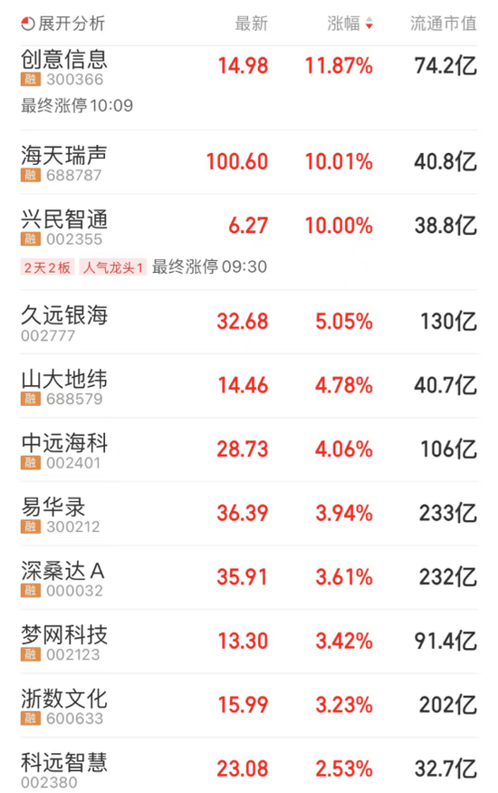今天上午,数据要素板块大涨,创意信息涨超11%,海天瑞声涨超10%。