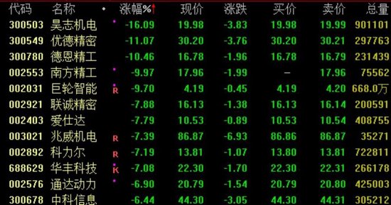 近期的热门赛道机器人概念今日回调走低,截至收盘,昊志机电跌约16%,盘中一度逼近跌停;优德精密、德恩精工跌超10%,南方精工跌停,通达动力跌近7%。