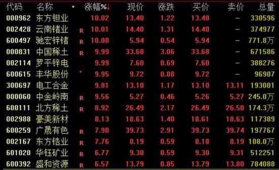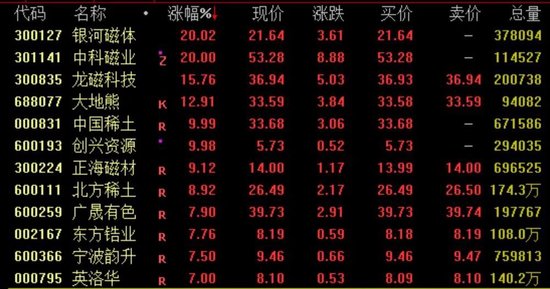 稀土板块盘中走势活跃,截至收盘,银河磁体、中科磁业“20cm”涨停,龙磁科技涨近16%,大地熊涨约13%,中国稀土、创兴资源涨停,正海磁材、北方稀土涨约9%。