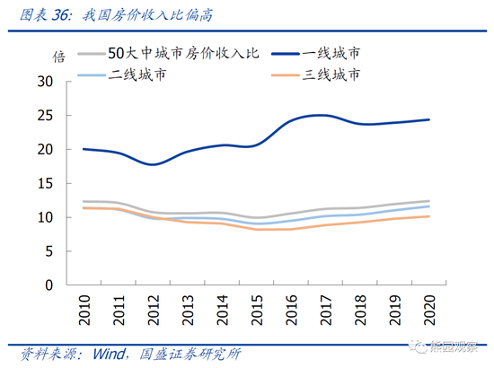 >地产方面,一方面,我国居民财富中地产占比更高,根据央行调查,2019年城镇居民住房占家庭总资产的59.1%。另一方面,我国房价长期趋于上涨,2020年50大中城市房价收入比达12.4倍,其中一线城市高达24.3倍,高于当前世界多数国家。