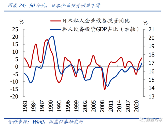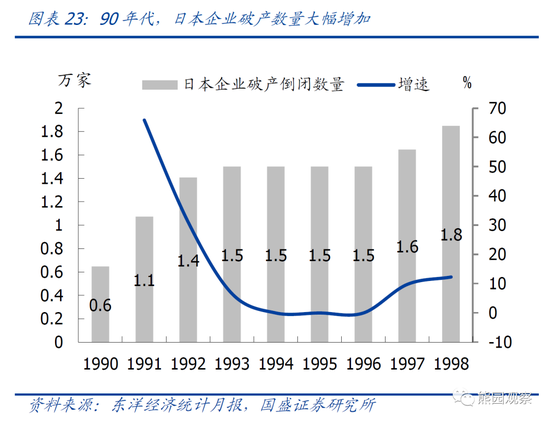 企业资产负债表衰退,破产剧增,投资低迷。由于泡沫经济时期日本企业将大量资金投入房地产和股市,导致泡沫破裂后资金亏损,无法保障正常经营。1991年破产企业数量达1.1万家,较1990年接近翻倍,并在整个90年代保持较高水平;企业投资迅速下行,企业设备投资的GDP占比由1990年的20%降至2010年的14.2%左右。