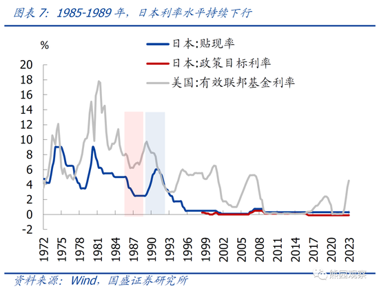 经济压力倒逼货币宽松。1985-1987年,日本央行将贴现率从5.0%降低至历史最低水平2.5%,M2-名义GDP增速剪刀差由1个点扩大至6.4个点。在1987美联储逐步开始加息后,日本央行出于对汇率升值影响经济担忧,也迟迟没有上调利率。