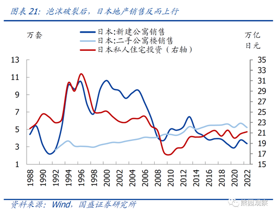 房价下降和地产销售、投资回升同时出现。注意到,1991年日本房价泡沫破裂后,1993-1996年日本地产销售、投资都出现明显反弹。这可能源于市场短期内并未对地产景气的长期下滑有充分认识,在利率下调、房价下跌的支持下,入场“抄底”。
