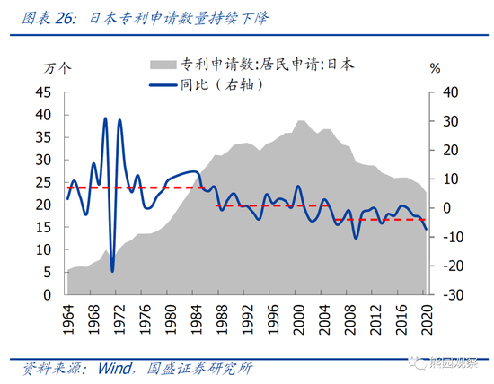 微观看,债务压力侵蚀企业活力和创新能力。泡沫破裂后,企业经营压力大增,只能被迫削减研发支出,企业研发支出增速从80年代的12.6%骤降至90年代以来的1.6%左右。造成的结果就是日本专利申请数量增速持续下行,近年来更是持续负增长。