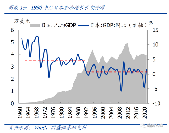 增长长期停滞。60至80年代,日本GDP增速中枢达5.2%,90年代至今,增速中枢降至1%左右,经济陷入停滞,对应人均GDP维持4万美元左右。
