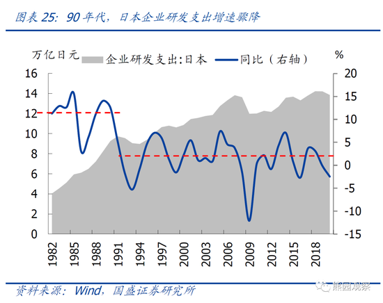 >企业:破产剧增,投资低迷,债务压力侵蚀企业活力和创新能力。1991年日本破产企业数量达1.1万家,较上年翻倍;企业设备投资GDP占比由高点的20%降至14.2%左右,企业研发支出增速从80年代的11.9%骤降至90年代以来的1.3%左右。