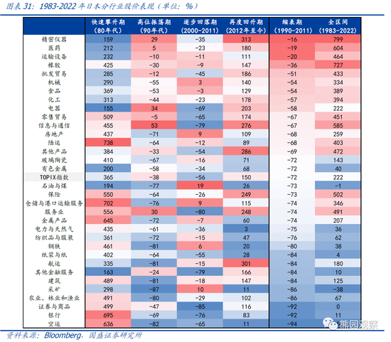 按照前文对日本居民债务发展阶段的划分,计算各行业股价表现,可发现1990-2011年泡沫破裂后,在日本居民杠杆高位震荡、转为下跌的过程中,各行业股价普跌,其中: