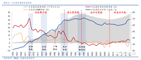 (1)快速攀升期(60-80年代):60年代,日本经济快速增长,推动居民持续加杠杆,居民债务规模由6万亿升至19万亿日元。70-80年代,日本经历了两次石油危机、日美广场协议等冲击,经济增速下台阶,日本央行实施宽松的货币政策,居民债务进一步扩张,规模攀升至1989年的272万亿日元,增速中枢达15.4%,居民杠杆率升至66.3%。