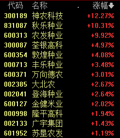 今天上午,玉米板块上涨,神农科技涨超12%,秋乐种业、农发种业等个股涨幅也较为显著。