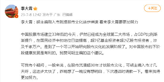 7月8日,英大证券首席经济学家李大霄表示:“胡主编刚入市就提股市文化进步神速,看来李大霄要更加努力。”