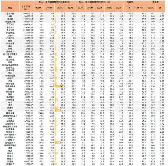 图表:A股分行业盈利与估值统计(预测值基于Wind一致预期)