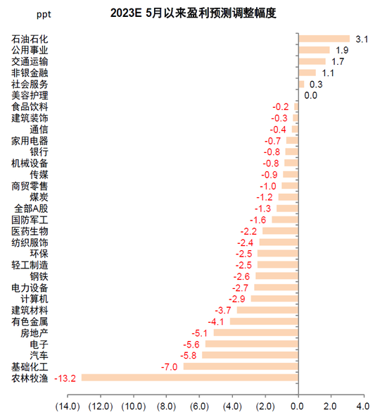 结构上,下游盈利增速普遍改善,出口链成为亮点。我们总结具体特征包括:1)商品价格回落影响能源和原材料行业盈利,下游成本改善。二季度国内大宗商品价格整体回落,影响能源和原材料行业业绩,与国内工业生产和房地产关联度较高的钢铁、基础化工和建材等原材料行业的业绩调整幅度可能较大,以往业绩相对有韧性的煤炭也将面临一定影响;能源原材料价格下降反映在中下游行业毛利率改善,中下游净利率的回升需要需求端改善配合。2)海外经济韧性较强,出口链业绩有望超预期。年初以来部分海外经济体增速强于市场预期,并且去库存也已持续较长时间,二季度中国出口增速整体也好于市场预期,一方面家电、机械等领域的出口呈现周期性走强,另一方面汽车尤其是新能源车等反映中国制造业竞争力提升的领域出口继续保持强劲增长,叠加上半年汇率影响,部分出口链行业二季度业绩可能成为超预期的亮点。3)下游消费复苏分化,需求尚待进一步修复。在2022年低基数的基础之上,叠加出口和上游价格回落因素,消费行业业绩增速有所改善,不过内生需求带来盈利改善的行业仍相对稀缺。4)TMT行业业绩仍在磨底,AI尚待兑现业绩增长。TMT领域的二季度复苏整体仍受增长影响,全球半导体周期以及手机等重点下游需求已初步呈现触底迹象,未来需要关注向上驱动力;AI当前得到较多上市公司重视,部分公司投入和研发有所增长而业绩兑现可能仍需较长时间,短期对TMT各环节的业绩拉动尚不显著。